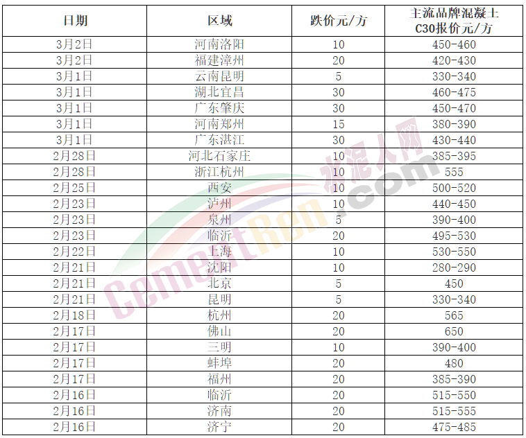 混凝土市場(chǎng)自節(jié)后開工以來,行情持續(xù)走低。同時(shí)受水泥、砂石、粉煤灰等原材料成本降低影響,市場(chǎng)價(jià)格有所下跌,競(jìng)爭(zhēng)壓力較大。
