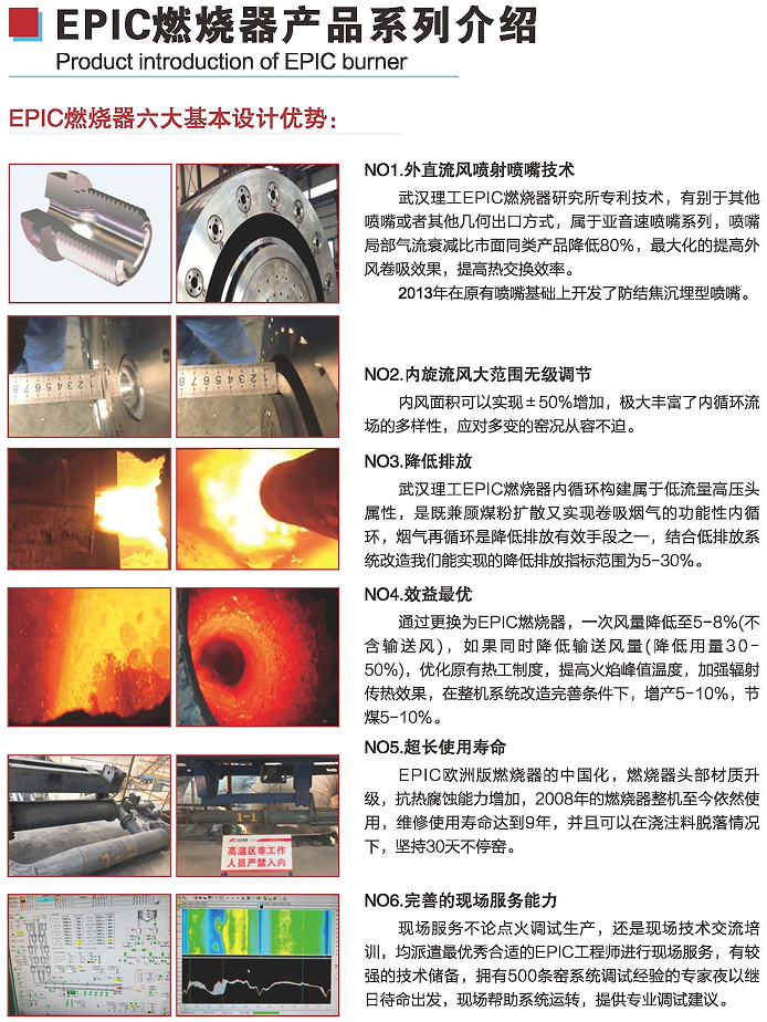 據(jù)了解,武漢祥焱EPIC燃燒器在設(shè)計(jì)之初就考慮低一次風(fēng)使用量及較高的使用動(dòng)能,大刀闊斧進(jìn)行改造設(shè)計(jì)創(chuàng)新,在低氮排放,強(qiáng)化煅燒,抗物流波動(dòng)等諸多生產(chǎn)的實(shí)際需求方面,達(dá)到國(guó)際技術(shù)領(lǐng)先優(yōu)勢(shì),是國(guó)內(nèi)同行業(yè)中唯一可以執(zhí)行拉法基歐洲壓力測(cè)試標(biāo)準(zhǔn)的全球供應(yīng)商。其特有的六大基本優(yōu)勢(shì)使得其在同行業(yè)中脫穎而出。