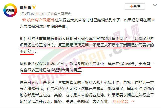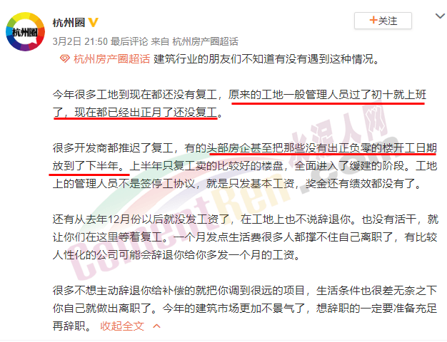 近期,有網(wǎng)友在社交媒體杭州房產(chǎn)圈超話欄目發(fā)起關(guān)于建筑行業(yè)的討論稱(chēng),很多工地到現(xiàn)在都還沒(méi)有復(fù)工,原來(lái)的工地一般管理人員過(guò)了初十就上班了,現(xiàn)在都已經(jīng)出正月了還沒(méi)復(fù)工。