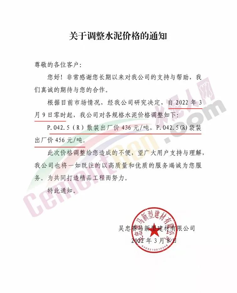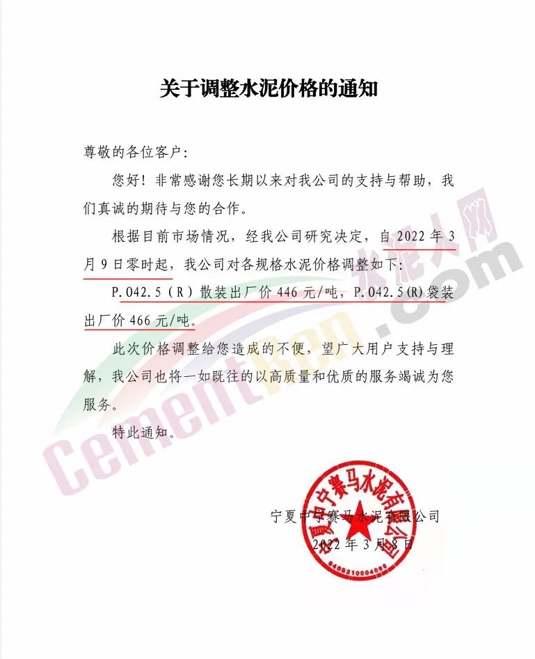 寧夏中寧賽馬水泥有限公司通知,根據(jù)目前市場(chǎng)情況,經(jīng)公司研究決定,自3月9日零時(shí)起,公司對(duì)各規(guī)格水泥價(jià)格進(jìn)行調(diào)整。其中P.O42.5(R)散裝出廠價(jià)446元/噸,P.O42.5(R)袋裝出廠價(jià)466元/噸。