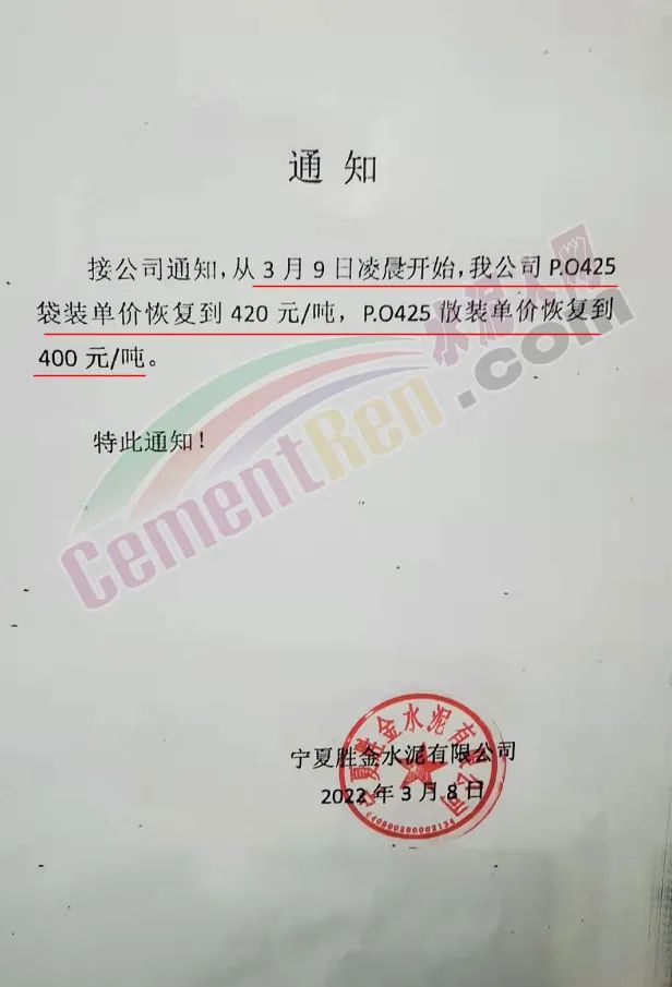 寧夏勝金水泥有限公司通知,從3月9日凌晨開始,公司P.O42.5袋裝水泥恢復(fù)到420元/噸,P.O42.5散裝水泥恢復(fù)到400元/噸。