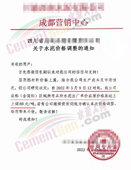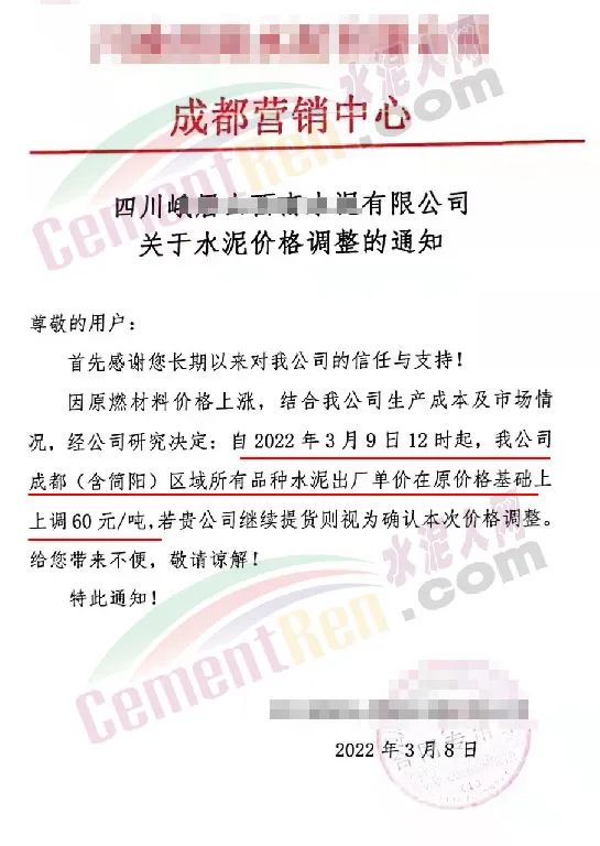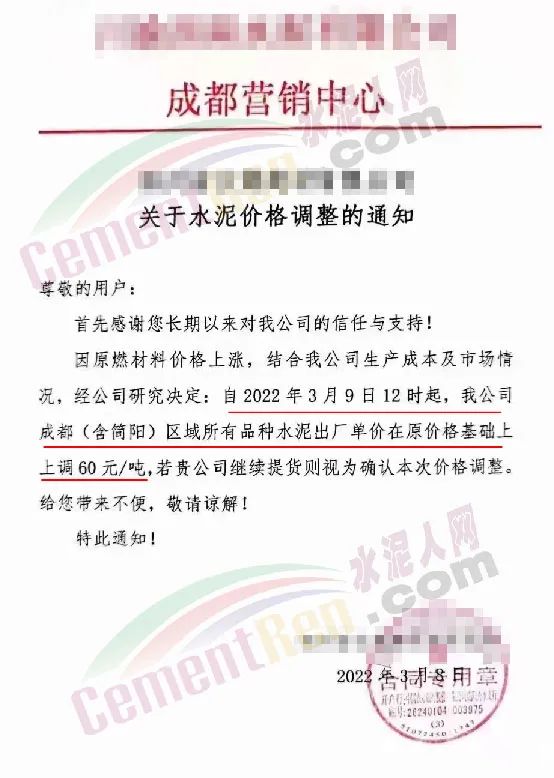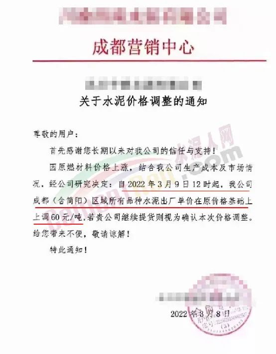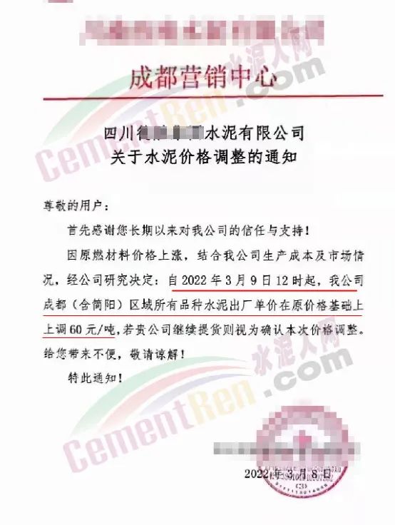 同日,四川成都區(qū)域主要品牌企業(yè)通知因原燃材料價(jià)格上漲,結(jié)合公司生產(chǎn)成本及市場(chǎng)情況,經(jīng)研究決定自3月9日12時(shí)上調(diào)成都(含簡(jiǎn)陽)區(qū)域所有品種水泥出廠價(jià)60元/噸。