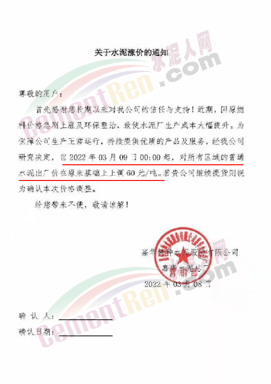 ?嘉華特種水泥通知稱,因原燃料價(jià)格急劇上漲及環(huán)保整治,致使水泥廠生產(chǎn)成本大幅提升。為保障公司生產(chǎn)正常支行,持續(xù)提供優(yōu)質(zhì)的產(chǎn)品及服務(wù),經(jīng)公司研究決定,自3月9日0時(shí)起,對(duì)所有區(qū)域的普遍水你先出廠價(jià)在原基礎(chǔ)上上調(diào)60元/噸。