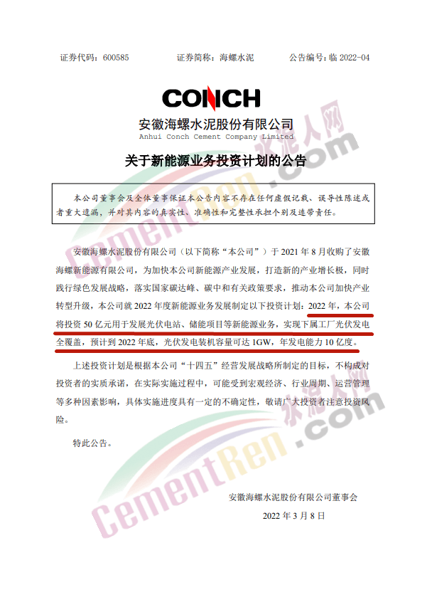 3月8日,安徽海螺水泥股份有限公司發(fā)布《關(guān)于新能源業(yè)務(wù)投資計(jì)劃的公告》稱,2022年,海螺水泥將投資50億元用于發(fā)展光伏電站、儲(chǔ)能項(xiàng)目等業(yè)務(wù),實(shí)現(xiàn)下屬工廠光伏發(fā)電全覆蓋;預(yù)計(jì)到2022年底,光伏發(fā)電裝機(jī)容量可達(dá)1GW,年發(fā)電能力10億度。