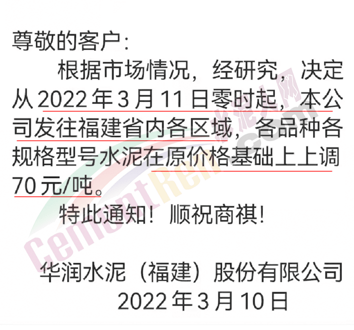 因原材料成本大幅上漲,根據(jù)目前市場行情,經(jīng)公司研究決定,自2022年3月11日零時(shí)起我司發(fā)往各區(qū)域的各品種各型號水泥出廠單價(jià)上調(diào)70元/噸。