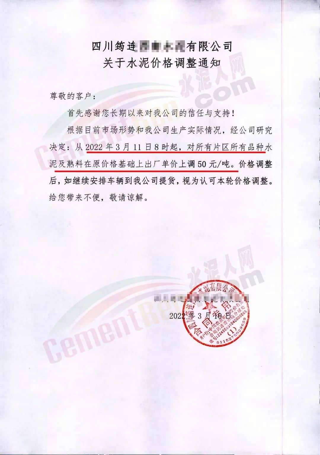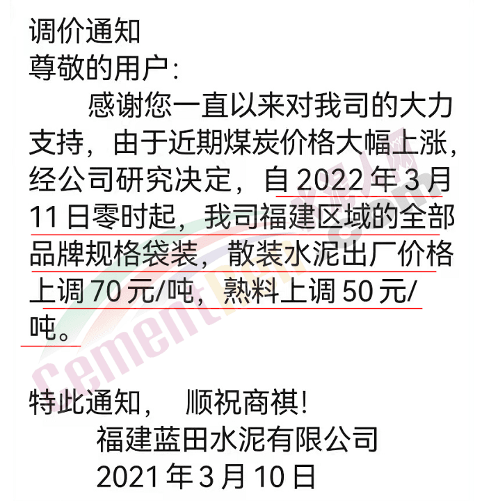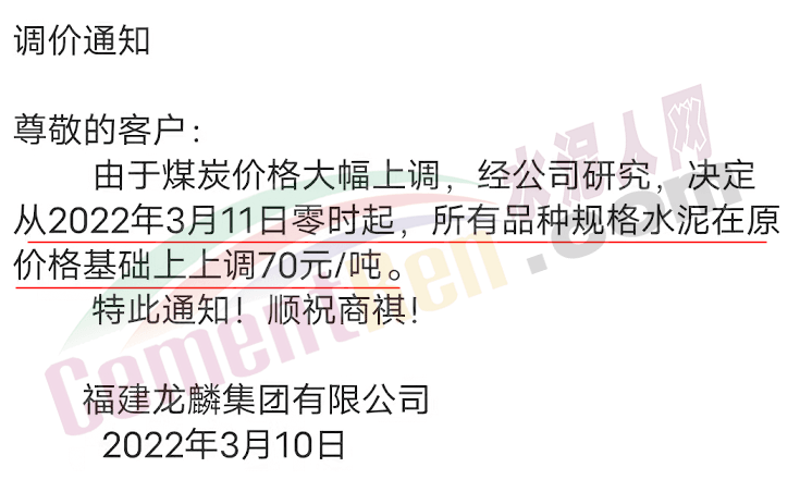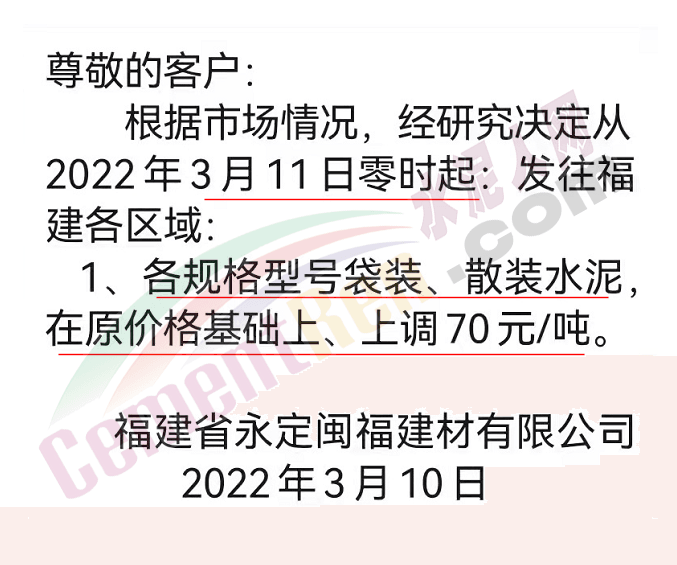 因原材料成本大幅上漲,根據(jù)目前市場行情,經(jīng)公司研究決定,自2022年3月11日零時(shí)起我司發(fā)往各區(qū)域的各品種各型號水泥出廠單價(jià)上調(diào)70元/噸 。