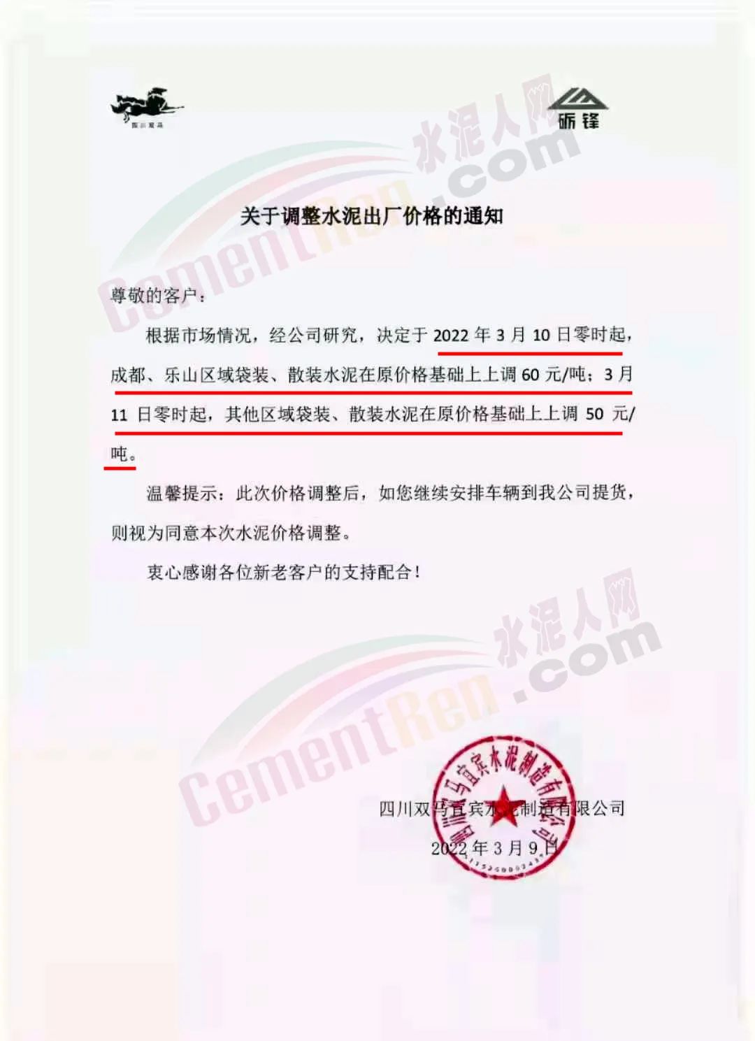 四川宜賓主要品牌企業(yè)通知,根據(jù)目前市場形勢和公司實(shí)際情況,經(jīng)公司研究決定從3月11日8時(shí)起,對所有片區(qū)所有品種水泥及熟料在原價(jià)基礎(chǔ)上上調(diào)50元/噸。