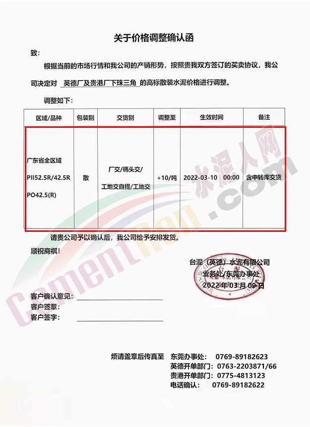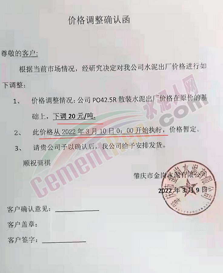 基于目前市場行情,結(jié)合我司實(shí)際情況,經(jīng)我公司研究決定,自2022年03月11日零時(shí)起,我公司發(fā)往全區(qū)域的各品牌、品種袋裝、散裝水泥、熟料的出廠價(jià)格,在原有基礎(chǔ)上上調(diào): 70元/噸。