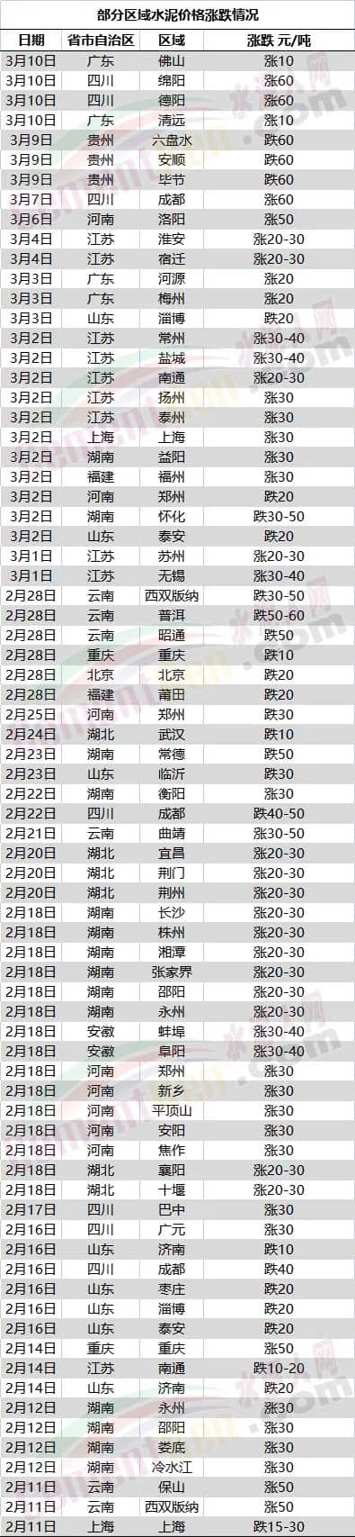 3月10日福建華潤水泥、藍(lán)田水泥、永定閩福建材、永安謀成水泥、福建金牛水泥、龍麟集團(tuán)、鑫城水泥、大縣新巖、春馳新豐等水泥企業(yè)通知自11日起上調(diào)水泥價(jià)格70元/噸, 藍(lán)田水泥熟料同步上調(diào)50元/噸。