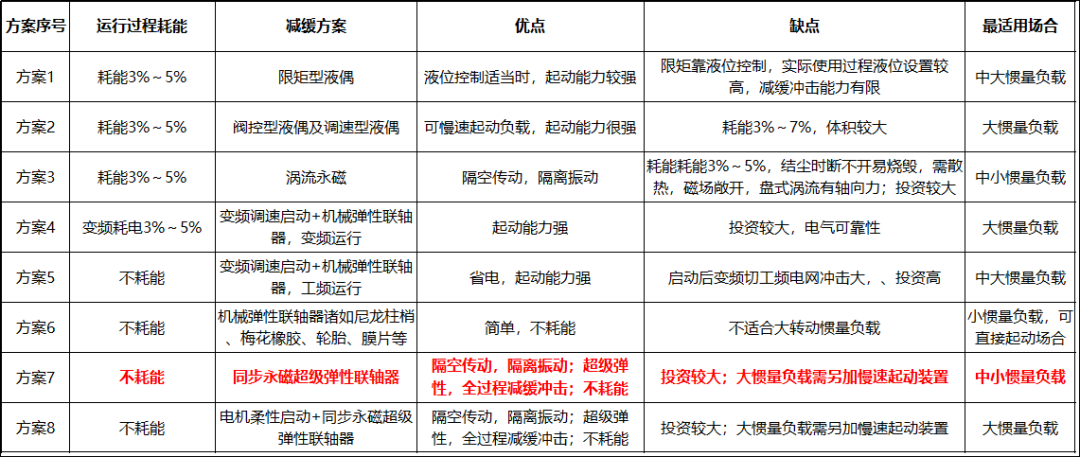 從上表可以看出,異步起動轉(zhuǎn)差運行類的柔性聯(lián)軸器存在3%~7%耗能,在選型過程應(yīng)盡量避免。柔性聯(lián)軸器盡量選用上表后四種減緩沖擊方案!同步運行類聯(lián)軸器運行過程不耗能,是首選的減緩沖擊方案。傳統(tǒng)的機械類同步聯(lián)軸器,由于其彈性減緩沖擊能力有限,單獨使用通常僅適用小慣量負(fù)載;同步永磁超級彈性聯(lián)軸器由于其超級彈性變形(7.5~15度,最大90度),減緩沖擊能力顯著增強,使同步聯(lián)軸器成功應(yīng)用到中等慣量負(fù)載,為節(jié)能傳動提供了一全新產(chǎn)品,也是唯一入選國家發(fā)改委《低碳目錄》的聯(lián)軸器。
