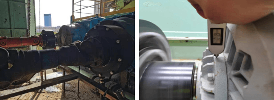 1、振動大幅減?。ìF(xiàn)場測量振動值:電機端水平2.3 mm/s,垂直0.9 mm/s,軸0.2 mm/s;減速機端水平0.4 mm/s,垂直0.2 mm/s,軸0.4mm/s)。