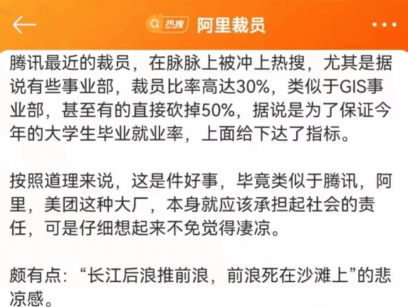 據(jù)水泥人網(wǎng)了解,近期阿里裁員、騰訊裁員迅速登錄熱門榜,騰訊預(yù)計裁員10~30%。而阿里旗下MMC事業(yè)群正計劃裁員,本次裁員數(shù)量約20%……現(xiàn)在的就業(yè)環(huán)境更是讓人后背發(fā)涼。