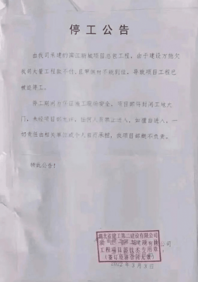 佳兆業(yè)濱江新城項(xiàng)目總包湖北省建工第二建設(shè)有限公司,發(fā)布停工公告稱,由于建設(shè)方拖欠該公司大量工程款不付,且甲供材(簡(jiǎn)單來說就是由甲方提供的材料)不能到位,導(dǎo)致項(xiàng)目工程已被迫停工。停工期間,項(xiàng)目部將封閉工地大門。