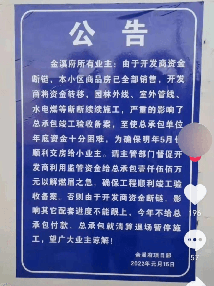 1月15日,金溪府項(xiàng)目部出具了一則公告。主要內(nèi)容為:由于開發(fā)商資金斷鏈,金溪府小區(qū)商品房已全部銷售,開發(fā)商將資金轉(zhuǎn)移,園林外線、室外管線、水電煤等斷斷續(xù)續(xù)施工,嚴(yán)重影響了總承包竣工驗(yàn)收備案,使總承包單位年底資金十分困難,為確保 5 月份順利交房。請(qǐng)主管部門督促開發(fā)商利用監(jiān)管資金給總承包壹仟伍佰萬元以解燃眉之急,確保工程順利竣工驗(yàn)收備案。否則由于開發(fā)商資金斷鏈,影響其它配套進(jìn)度不能跟上,今年不給總承包付款,總承包就清算退場(chǎng)暫停施工。