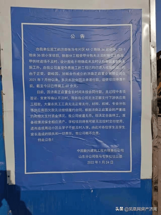 中國新興建筑工程有限責(zé)任公司發(fā)布公告稱,公司施工的山東濟(jì)南張馬屯片區(qū)AX-2地塊36班初中、CX-1地塊36班小學(xué)項(xiàng)目,由于正榮、碧桂園、旭輝合作成立的濟(jì)南正啟置業(yè)有限公司自2021年7月份以來,多次未按合同及承諾付款,迫使項(xiàng)目停滯不前,施工方現(xiàn)決定全面停工。