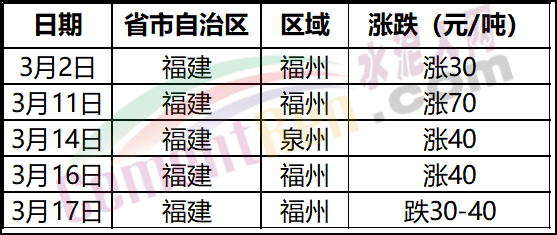 最具戲劇性的是前一天剛剛上調(diào)40元/噸的福建福州、泉州區(qū)域,17日通知水泥價(jià)格跌30-40元/噸,企業(yè)解釋稱,市場(chǎng)需求表現(xiàn)不佳,企業(yè)間競(jìng)爭(zhēng)激勵(lì),漲價(jià)無法落實(shí)。