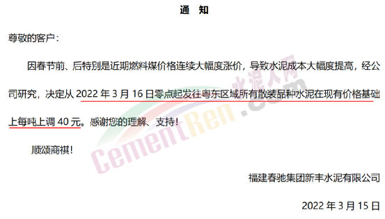 福建春馳集團(tuán)新豐水泥有限公司通知稱,因春節(jié)前、后特別是近期燃料煤價(jià)格連續(xù)大幅度漲價(jià),導(dǎo)致水泥成本大幅度提高,經(jīng)公司研究,決定從2022年3月16日零點(diǎn)起發(fā)往粵東區(qū)域所有散裝品種水泥在現(xiàn)有價(jià)格基礎(chǔ)上每噸上調(diào)40元。