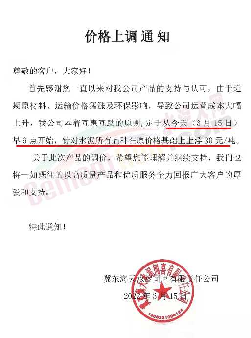 近日冀東海天水泥聞喜公司通知稱,由于近期原材料、運(yùn)輸價(jià)格猛漲及環(huán)保影響,導(dǎo)致公司運(yùn)營(yíng)成本大幅上漲,自3月15日起,對(duì)水泥所有品種在原價(jià)基礎(chǔ)上上浮30元/噸。