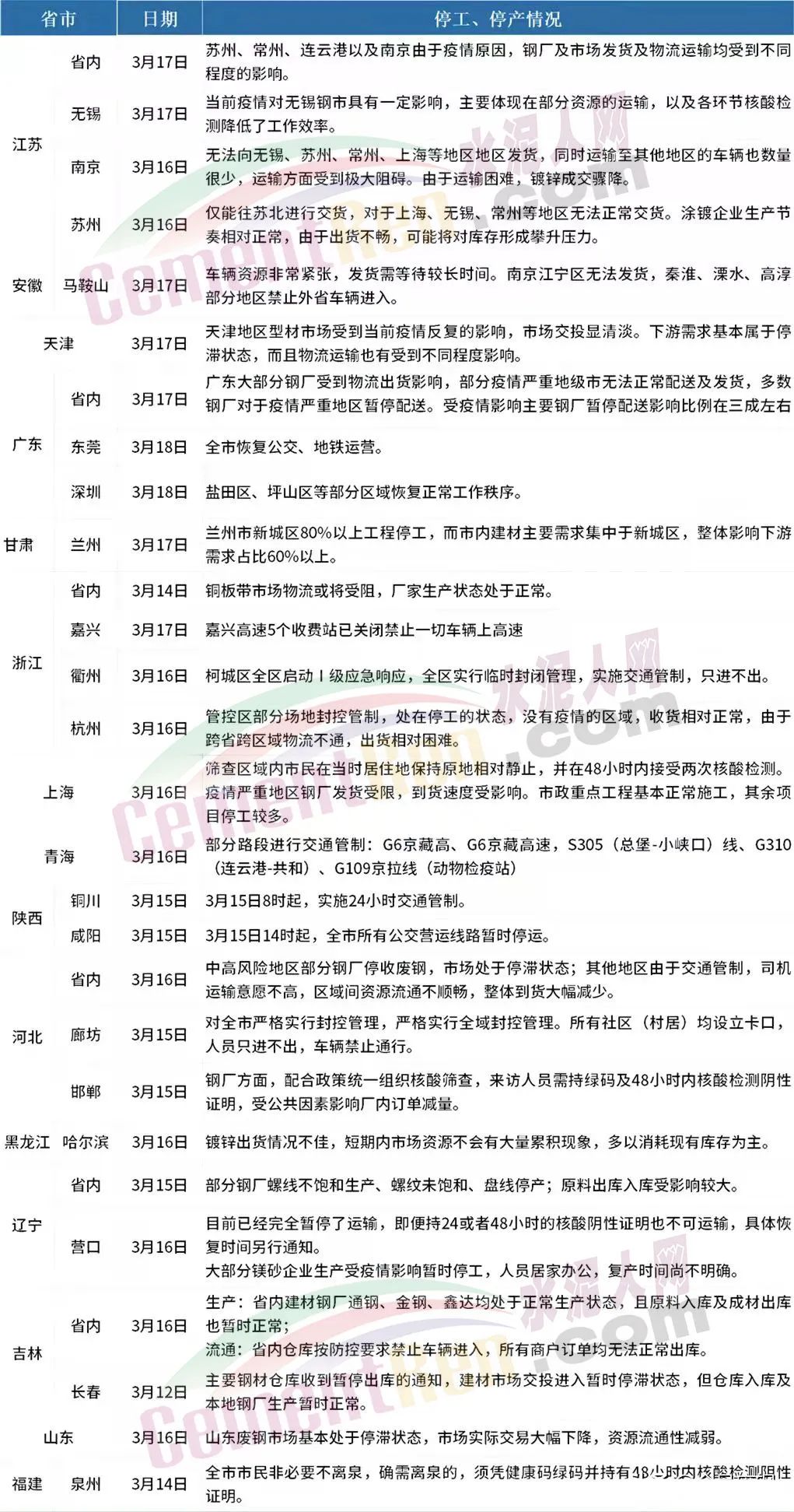 1 江蘇省內(nèi)蘇州、常州、連云港以及南京由于疫情原因,鋼廠及市場發(fā)貨及物流運輸均受到不同程度的影響。