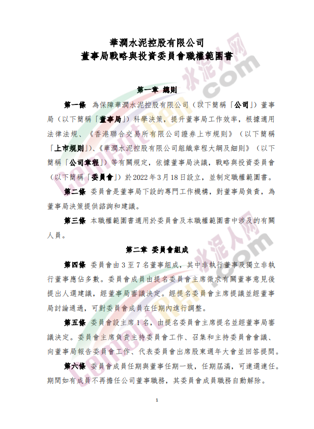 華潤水泥控股公布,自2022年3月18日起,董事局成立戰(zhàn)略與投資委員會,撤銷執(zhí)行委員會,薪酬委員會更名為薪酬與考核委員會,企業(yè)管治委員會更名為風(fēng)險與合規(guī)委員會。