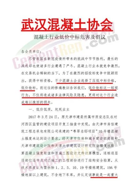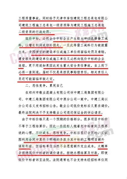 日前,武漢混凝土協(xié)會發(fā)布《混凝土行業(yè)低價中標(biāo)危害及倡議》給會員單位稱,混凝土行業(yè)本就竟?fàn)幖ち?,在交易機(jī)會稀缺的當(dāng)下,為了在激烈的招投標(biāo)競爭中脫穎而出,獲得中標(biāo)資格,不少混凝土企業(yè)選擇了壓低中標(biāo)價格,低價搶標(biāo)。而過往的慘痛教訓(xùn)告訴我們,低價搶標(biāo)這一短視行為,不僅將造成諸多法律風(fēng)險及隱患,更將對這個行業(yè)造成難以挽回的損失。
