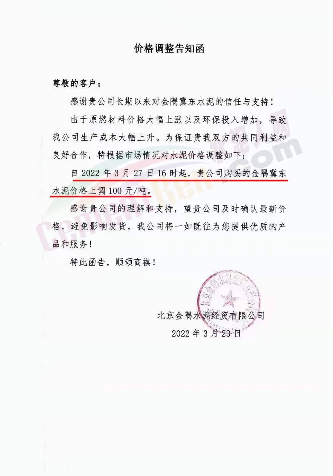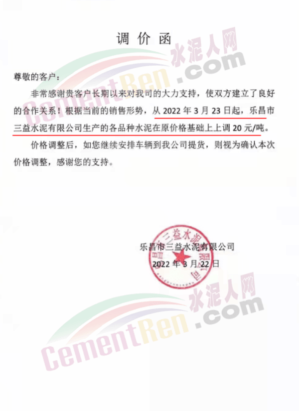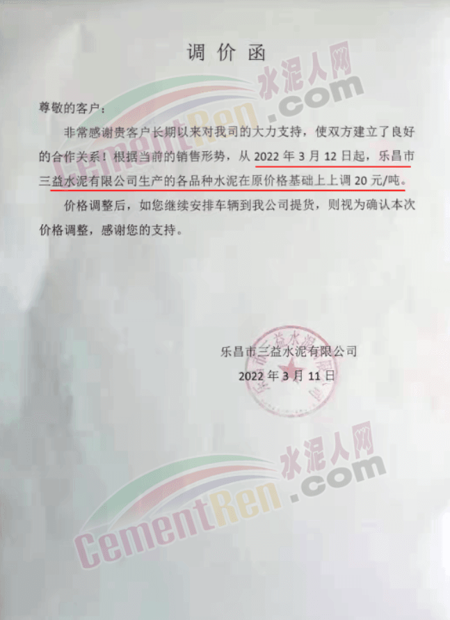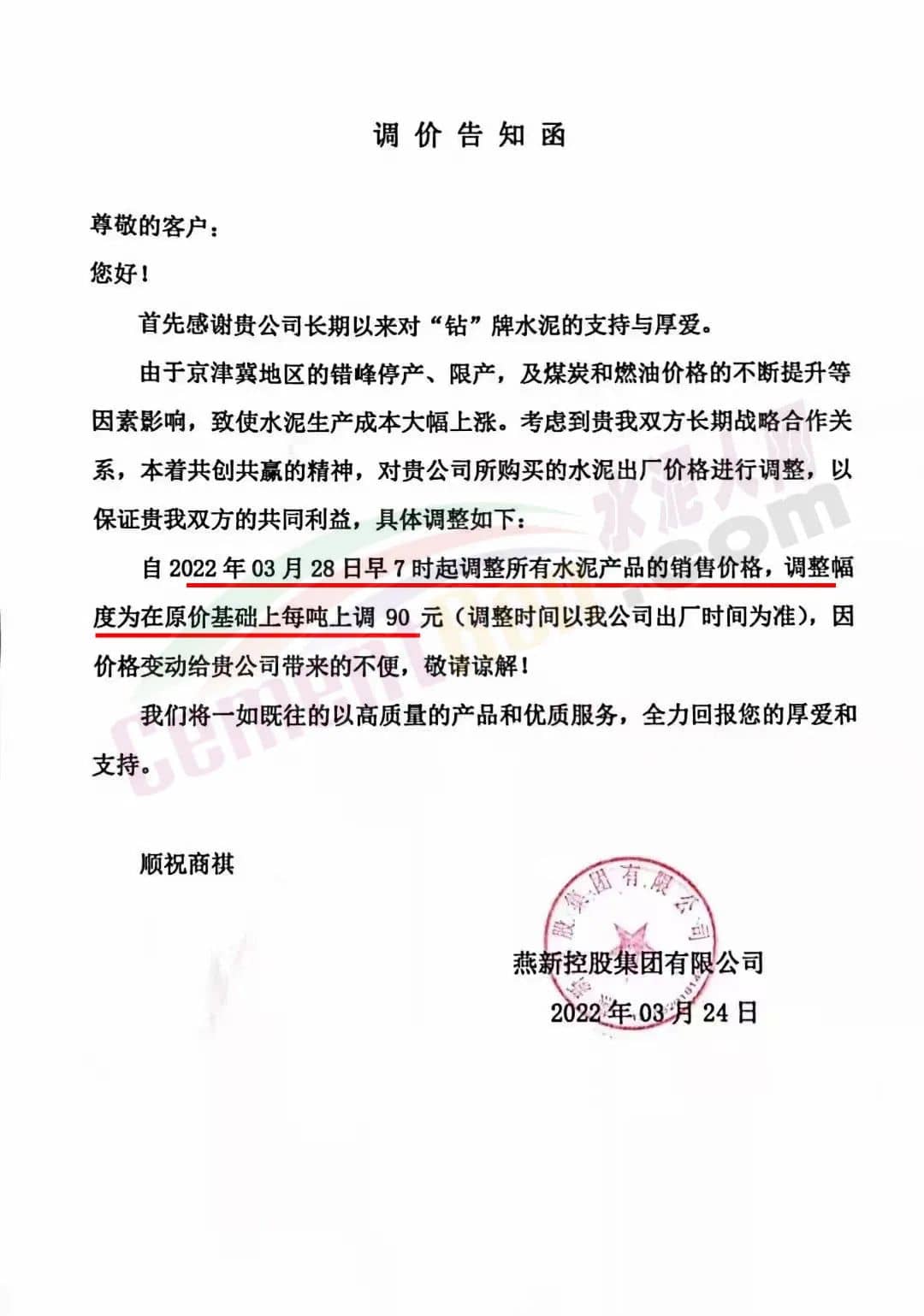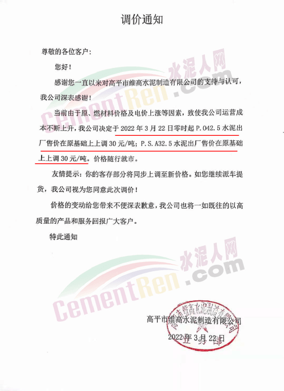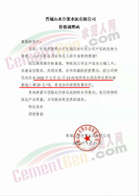 據(jù)市場反饋,不僅山西區(qū)域,近幾日多省市區(qū)域水泥價格持續(xù)上調中,3月21日,南京部分主流品牌水泥價格漲20元/噸,漲價主要針對江北部分地區(qū)。3月21日濟南水泥價格漲10-20元/噸,企業(yè)調價通知稱因油價上漲,原材料價格上漲,水泥綜合成本提升。3月19日,江西贛州地區(qū)部分廠家推漲水泥價格30-40元/噸。3月19日,湖北襄陽、十堰地區(qū)部分廠家通知上調水泥價格30-50元/噸。