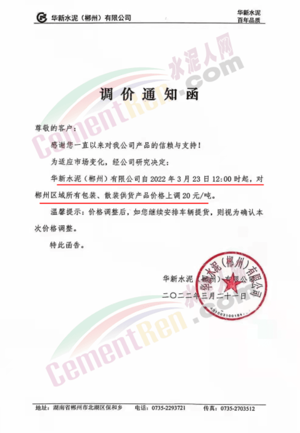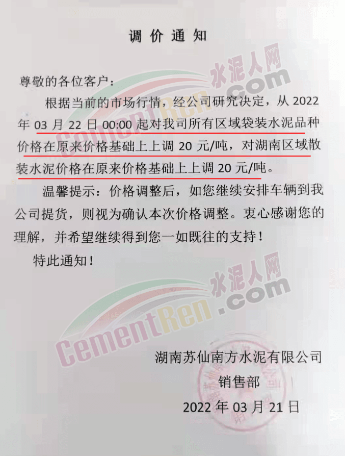 同期,湖南郴州及周邊區(qū)域多家企業(yè)通知上調水泥價格20元/噸。