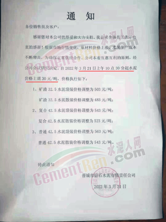 據(jù)水泥人網信息中心數(shù)據(jù),3月20日前后,山西多區(qū)域水泥價格通知上調,山西晉城多家企業(yè)通知上調水泥價格30元/噸。晉城市鉆石水泥有限責任公司通知稱,根據(jù)市場行情變化,原材料價格上漲,水泥生產成本不斷增高,為確保正常供應合作,公司本著互惠互利的原則,經公司會議研究決定自3月21日上午10時30分上調水泥價格30元/噸,上調后礦渣32.5袋裝水泥執(zhí)行503元/噸,復合42.5袋裝水泥執(zhí)行543元/噸,普通42.5散裝水泥執(zhí)行543元/噸。