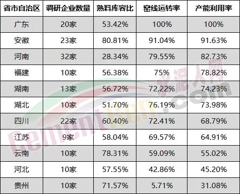 熟料庫容、窯線運轉及產能利用率方面,貴州、廣東、福建、安徽、江蘇、河北、湖北、湖南、河南、云南、四川十多個區(qū)域熟料庫容比仍處于50%以上,窯線運轉率和產能利用率僅廣東省達到了100%。