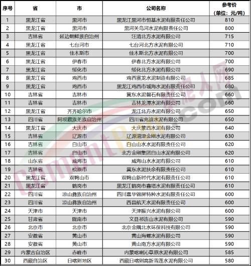 水泥人網(wǎng)信息中心數(shù)據(jù)顯示,截止3月31日,重點監(jiān)控的613家企業(yè),P.O42.5散裝水泥報價最高的是黑龍江省黑河市兩家企業(yè),報價在800-810元/噸,報價最低的是云南省玉溪市,三家企業(yè)報價在290-300元/噸。