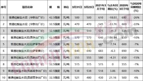 2020年同期數(shù)據(jù)顯示,普通硅酸鹽水泥32.5強度拉薩零售價為600元/噸,普通硅酸鹽水泥42.5強度拉薩零售價為690元/噸,十家企業(yè)2020年同期報價較目前價格力十跌一升,跌幅在7%~26%。
