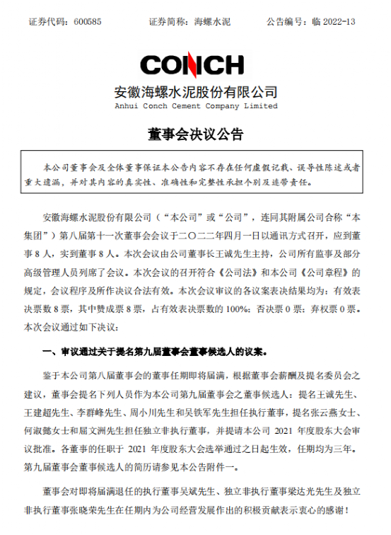 日前,海螺水泥發(fā)布公告稱,安徽海螺水泥股份有限公司第八屆第十一次董事會(huì)審議通過(guò)關(guān)于提名第九屆董事會(huì)董事候選人的議案。根據(jù)董事會(huì)薪酬及提名委員會(huì)之建議,董事會(huì)提名王誠(chéng)先生、王建超先生、李群峰先生、周小川先生和吳鐵軍先生擔(dān)任執(zhí)行董事,提名張?jiān)蒲嗯?、何淑懿女士和屈文洲先生?dān)任第九屆董事會(huì)獨(dú)立非執(zhí)行董事。各董事的任職于2021年度股東大會(huì)選舉通過(guò)之日起生效,任期均為三年。
