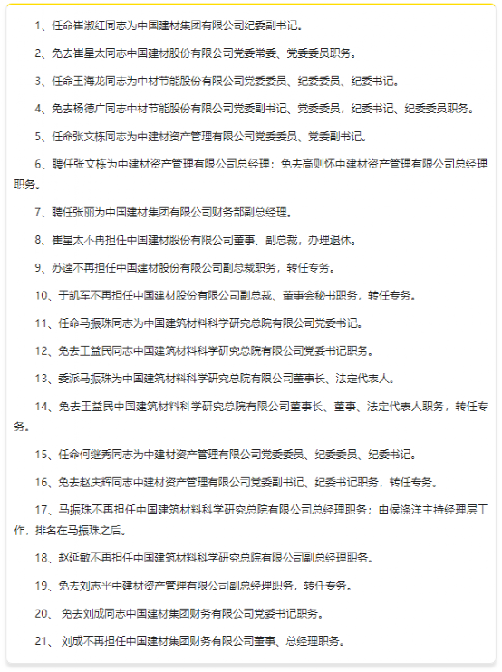 1月初,中國(guó)建材集團(tuán)有限公司發(fā)布數(shù)十條高層任免通知,對(duì)中國(guó)建材部分高層職務(wù)進(jìn)行了重新任免。