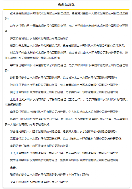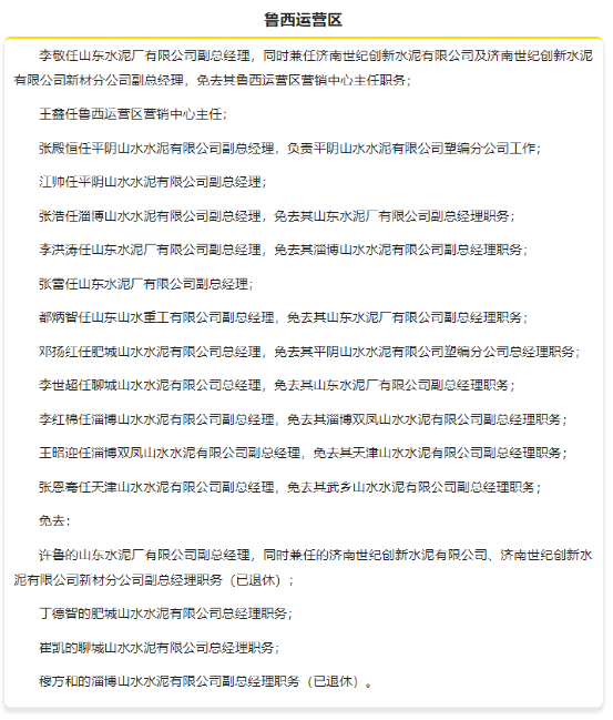 1月中旬,山東山水集團(tuán)有限公司發(fā)布人事任命,對(duì)旗下多個(gè)運(yùn)營(yíng)區(qū)進(jìn)行人事調(diào)整,涉及魯西、魯東、魯南、東北和山西等多個(gè)區(qū)域。