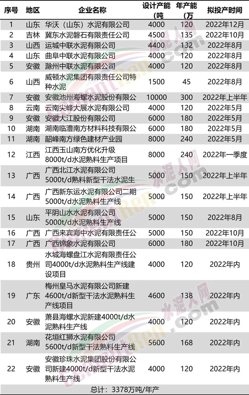 據(jù)水泥人網(wǎng)此前消息,2021年下半年點(diǎn)火投產(chǎn)的9個(gè)項(xiàng)目產(chǎn)能規(guī)模日產(chǎn)能達(dá)到52000噸,年產(chǎn)1560萬噸。而且全部達(dá)到綠色、智能、超低排放要求。(相關(guān)鏈接:“搶灘”!多條“智能化”水泥生產(chǎn)線集中點(diǎn)火!)