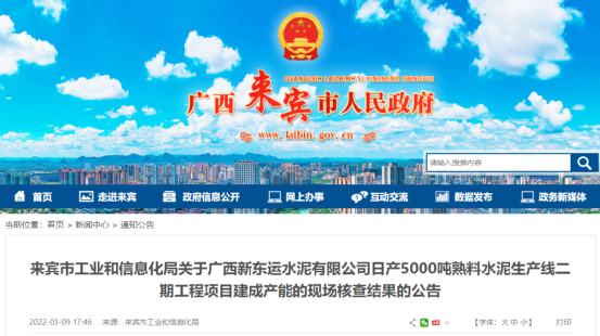日前廣西來賓市工業(yè)和信息化局發(fā)布公告稱,已于2022年3月1日,組織廣西水泥行業(yè)協(xié)會(huì)專家組到廣西新東運(yùn)水泥有限公司已建成的5000t/d熟料水泥生產(chǎn)線二期工程項(xiàng)目產(chǎn)能進(jìn)行現(xiàn)場核實(shí)并出具了核查一致結(jié)果公告。