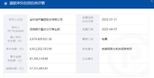 金科地產(chǎn)集團(tuán)的票據(jù)承兌信用信息詳情顯示, 累計(jì)逾期發(fā)生額約8130.66萬(wàn)元,逾期余額約5735.17萬(wàn)元。