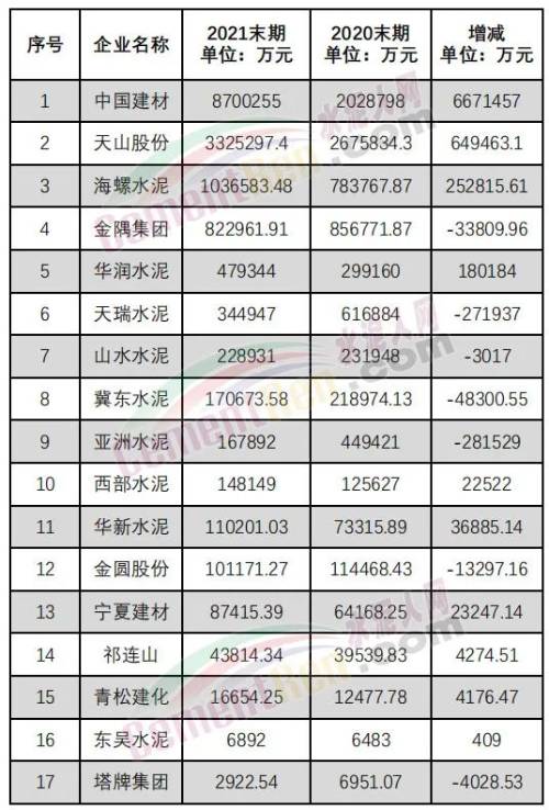 據(jù)水泥人網(wǎng)不完全統(tǒng)計(jì),水泥行業(yè)17家上市公司,2021年末期應(yīng)收票據(jù)和賬款“10增7減”。其中中國(guó)建材、天山股份、海螺水泥、華潤(rùn)水泥、華新水泥、寧夏建材、西部水泥、祁連山、青松建化、東吳水泥等10家企業(yè)較上年同期均有增長(zhǎng)。山水水泥、塔牌集團(tuán)、金圓股份、金隅集團(tuán)、冀東水泥、天瑞水泥、亞洲水泥7家企業(yè)有所減少。