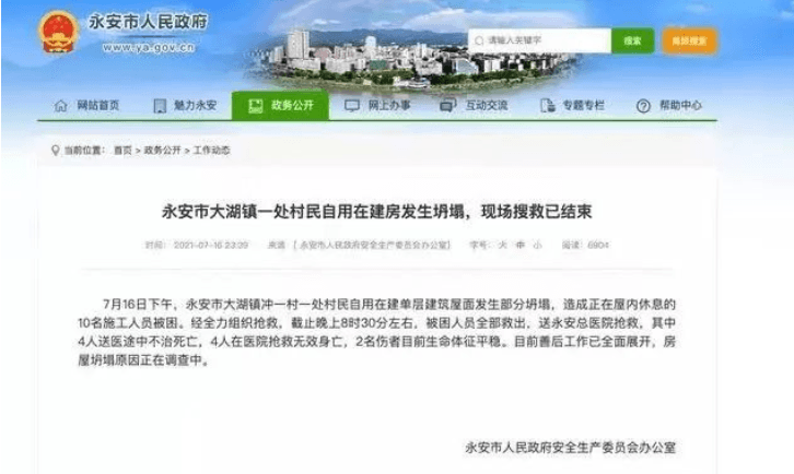▲2021年7月16日,福建三明永安市大湖鎮(zhèn)沖一村一處村民自用在建單層建筑屋面發(fā)生部分坍塌,造成正在屋內(nèi)休息的10名施工人員被困。其中4人送醫(yī)途中不治死亡,4人在醫(yī)院搶救無效身亡。