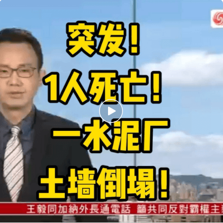 4月19日傍晚,中臺灣臺中市太平區(qū)的一座水泥廠擋土墻突然發(fā)生了坍塌,導致一名泰籍的工人遭到活埋,當場死亡,意外的原因有關(guān)單位仍在調(diào)查當中。