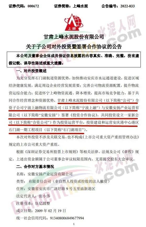 日前,上峰水泥發(fā)布公告,為充分發(fā)揮石門湖航道資源優(yōu)勢,加快推動安慶市水運通道建設,促進區(qū)域經(jīng)濟健康發(fā)展,滿足周邊企業(yè)經(jīng)營發(fā)展需要;完善公司物流資源配置,提升物流營運綜合能力;促進懷寧上峰物資流通、降本增效,提高市場競爭能力,基于共同合作經(jīng)營理念和資源優(yōu)勢,公司全資子公司寧波上融物流有限公司與安徽安揚產(chǎn)業(yè)運營有限公司簽署《投資合作協(xié)議》,共同投資設立一家新公司作為投資運營平臺,投資建設和運營安慶港中心港區(qū)石門湖一期工程項目。