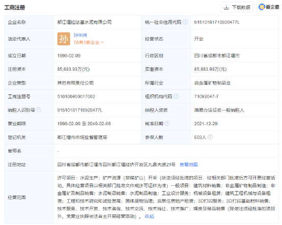 據(jù)工商注冊(cè)信息顯示,都江堰拉法基水泥有限公司成立于1999年02月09日,注冊(cè)地位于四川省成都市都江堰市四川都江堰經(jīng)濟(jì)開發(fā)區(qū)九鼎大道21號(hào),法定代表人為孫華鴻。