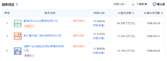 股東信息顯示,其大股東為豪瑞(四川)企業(yè)管理有限公司,持股比例為74.9962%。