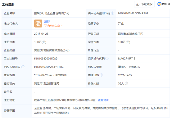 工商注冊(cè)信息顯示,豪瑞(四川)企業(yè)管理有限公司成立于2017年04月28日,注冊(cè)地位于成都市錦江區(qū)錦東路568號(hào)摩根中心2棟32樓5--8室,法定代表人為潘駒。經(jīng)營(yíng)范圍包括企業(yè)管理咨詢、市場(chǎng)營(yíng)銷策劃、會(huì)議展覽咨詢、并提供相關(guān)技術(shù)服務(wù)。(依法須經(jīng)批準(zhǔn)的項(xiàng)目,經(jīng)相關(guān)部門批準(zhǔn)后方可開展生產(chǎn)經(jīng)營(yíng)活動(dòng)),企業(yè)類型為其他(外商投資有限責(zé)任公司)。