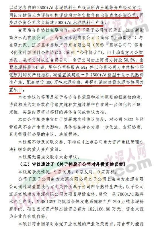 變更后合作協(xié)議主要內(nèi)容:公司下屬子公司宜興天山、江蘇新街南方水泥有限公司、上海南方水泥有限公司(簡稱“上海南方”)與金墅水泥、江蘇晟宇房地產(chǎn)開發(fā)有限公司(簡稱“晟宇公司”)簽署《優(yōu)化升級項(xiàng)目合作協(xié)議》(簡稱“合作協(xié)議”)。由上海南方與金墅水泥、晟宇公司成立合資公司,合資公司由上海南方持股 50.5%、金墅水泥持股 44.5%、晟宇公司持股占 5%;并以合資公司為主體按市場化原則購買產(chǎn)能指標(biāo),減量置換建設(shè)一條 7500t/d 新型干法水泥熟料生產(chǎn)線,配套建設(shè) 300 萬噸水泥粉磨,并擇機(jī)適時(shí)建設(shè)水泥窯協(xié)同處置項(xiàng)目。具體公告如下: