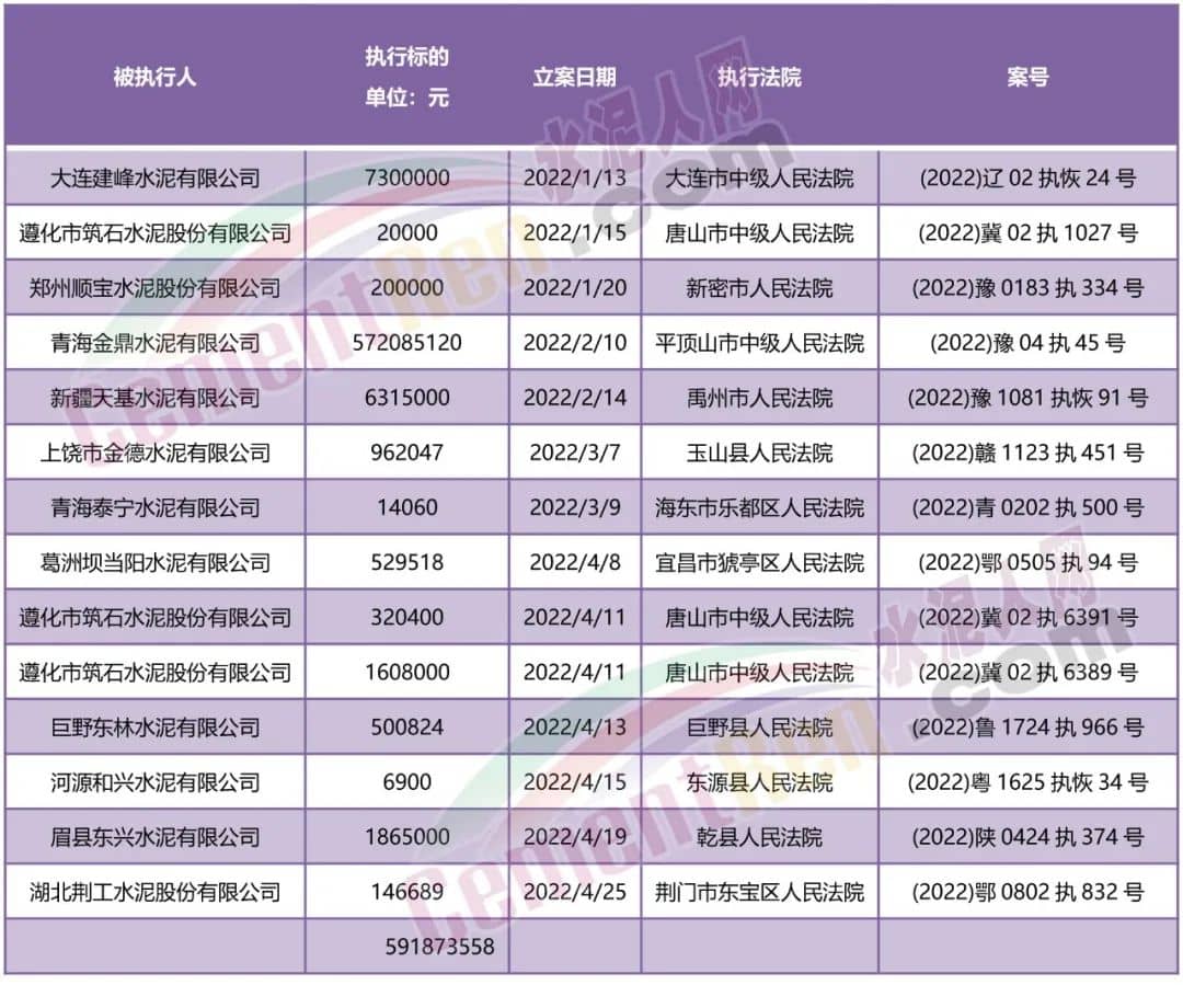 據(jù)相關(guān)數(shù)據(jù)顯示,今年以來涉及司法風(fēng)險被執(zhí)行標(biāo)的的水泥公司共有12家,執(zhí)行標(biāo)的合計金額約5.92億。