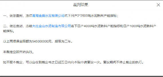 水泥人網(wǎng)注意到,河南省瑞象物資貿(mào)易有限公司與青海金鼎水泥有限公司,大連金山水泥制造有限公司相關(guān)債權(quán)轉(zhuǎn)讓合同糾紛民事裁定書裁定結(jié)果顯示青海金鼎水泥有限公司名下日產(chǎn)2*2500噸水泥熟料產(chǎn)能指標(biāo)被依法查封、凍結(jié);被大連金山水泥制造有限公司名下日產(chǎn)4000噸水泥熟料產(chǎn)能指標(biāo)和日產(chǎn)1000噸水泥熟料產(chǎn)能指標(biāo),被依法查封、凍結(jié)。以上兩項保全限額為545000000元,期限為三年。