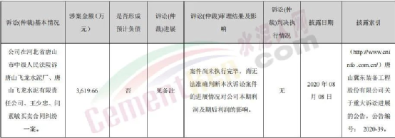 冀東裝備以唐山飛龍水泥廠、唐山飛龍水泥有限責(zé)任公司、唐山飛龍水泥廠投資人王少忠、閆素敏為被告向唐山市中級人民法院提起訴訟,要求唐山飛龍水泥廠支付合同款及違約金等共計36,196,612.86元;2020年8月27日,冀東裝備已向法院申請強制執(zhí)行。