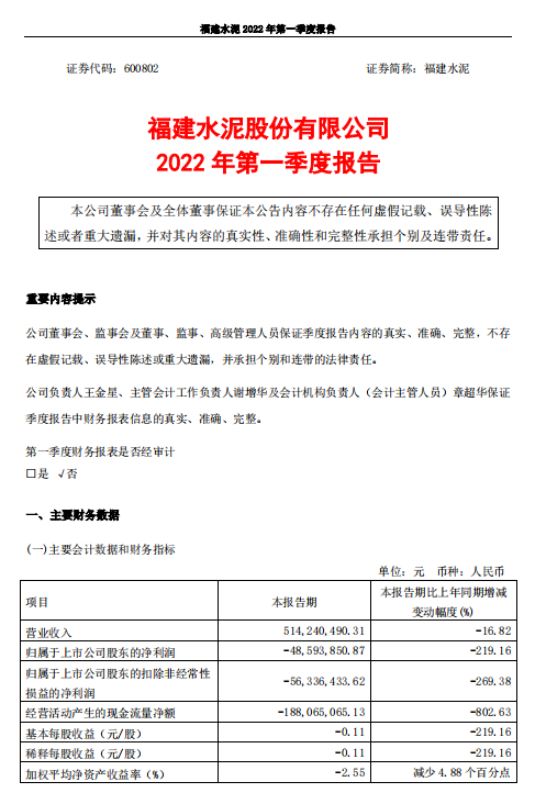 福建水泥4月29日晚間發(fā)布一季度業(yè)績公告稱,2022年第一季度營收約5.14億元;歸屬于上市公司股東的凈利潤虧損約4859萬元;基本每股收益虧損0.11元。
