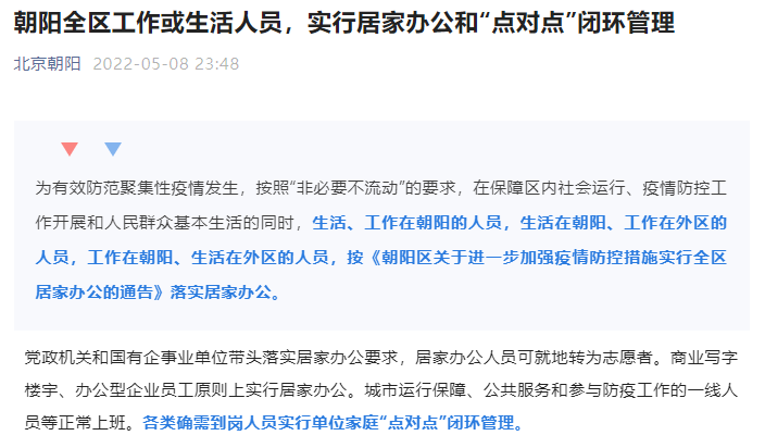 房山區(qū)發(fā)布了進(jìn)一步加強(qiáng)疫情防控措施實(shí)行全區(qū)居家辦公的通告,商業(yè)寫字樓宇、辦公型企業(yè)員工原則上實(shí)行居家辦公,各類確需到崗人員實(shí)行單位家庭“點(diǎn)對(duì)點(diǎn)”閉環(huán)管理。